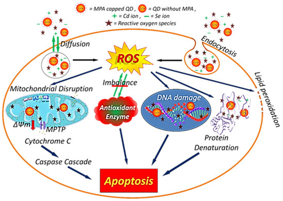Interactions of NCs with intracellular components, the release of Cd2+ ions (degradation of core-only NCs), and the generation of free radicals are responsible for NCs’ cytotoxicity [10]. Studies have observed that the degradation of NCs, hence the release of Cd ions, occurs whenever they are exposed to an oxidative environment and even during synthesis and processing. The addition of a different shell can achieve a reduction in oxidation [25]. Free radical production is an important factor that contributes to NCs’ toxicity [26,27,28].