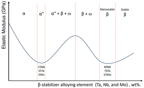 In the production of new titanium alloys with low elastic moduli, the Ti-15Nb, Ti-40Nb, Ti-25Ta, Ti-50Ta, Ti-5Mo, and Ti10Mo alloys stand out. These alloys have low elastic modulus values due to the action of β-stabilizing elements (Ta, Nb, and Mo). Figure 1 illustrates titanium alloys’ elastic modulus value changes with the addition of isomorphic β-stabilizer elements [20,21,22]. It can be observed that commercially pure titanium (α-HCP) has a high elastic modulus. With the addition of small quantities of β-stabilizing elements, there is a drop in the value of the elastic modulus due to the decrease in the atomic bonding forces that substitutional atoms cause.