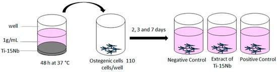 Schematic of the experiment setup for the analysis of biocompatibility of extracts of Ti-15Nb alloy.