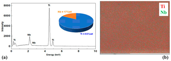 To verify the chemical composition, stoichiometry, and homogeneity of the Ti-15Nb alloy, composition analyses were carried out using energy-dispersive X-ray spectroscopy (EDS) in an Oxford INCA model.