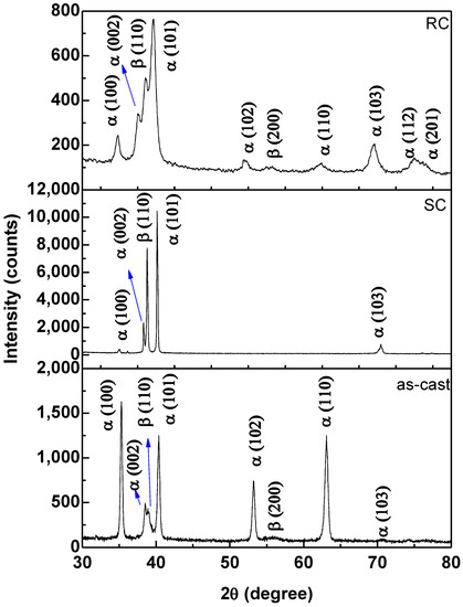 For the as-cast condition, it can be observed that the α peaks (100), (102), and (110) were more intense than the prominent peak (101), showing that there was a preferential orientation of the crystallographic planes. The emergence of these planes was due to the nonuniform cooling rate of the ingot in contact with the water-cooled copper crucible. Heat treatments followed by slow and rapid cooling (SC and RC) efficiently eliminated this type of texture and preferential orientation, and the α phase peak (101) became the most intense, as expected for HCP alloys without the influence of textures and deformations.