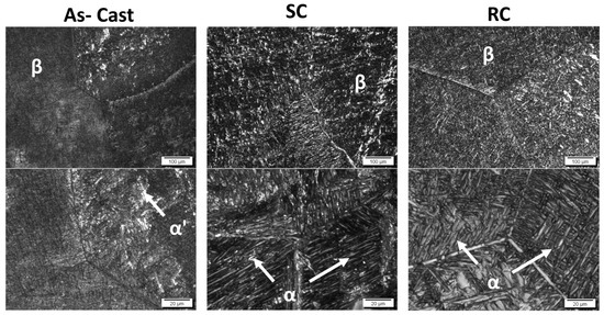 Ti-15Nb alloy micrographs after melting (as-cast) and heat treatments with slow (SC) and rapid cooling (RC).