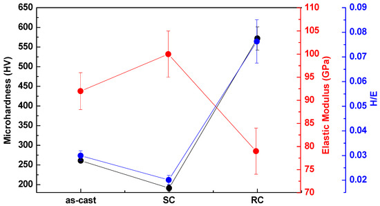 The H/E ratio, the quotient of the hardness value and the elastic modulus, is a simple analysis used to predict the wear resistance of titanium alloys [40]. The higher the H/E ratio is, the greater the probability that the alloy has good resistance to wear phenomena [42]. It can be observed that the alloy in the RC condition had a higher H/E value (~0.075), indicating that this study condition made the Ti-15Nb alloy more resistant to wear; in addition, it can be observed that the trend of the H/E curve followed the microhardness value, and, generally, metals with high hardness values tend to be resistant to abrasive wear.