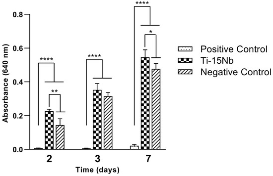 Indirect cytotoxicity test of Ti-15Nb alloy after RC heat treatment in a primary culture of osteogenic cells for 2, 3, and 7 days. PC: positive control—1% phenol; NC: negative control—polystyrene. ANOVA and post hoc Tukey. * p < 0.05, ** p < 0.01, and **** p < 0.001.