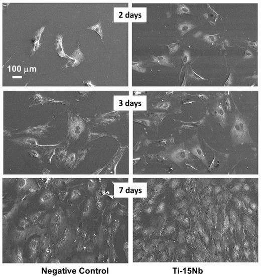 The indirect cell morphology of the Ti-15Nb alloy was evaluated after heat treatment. The cells were cultivated under the surface of the glass, and the base medium was replaced by the extracts of the alloys (1 g/mL) for 2, 3, and 7 days. After this time, the cells were fixed in 4% glutaraldehyde (Electron Microscopy Sciences, Washington, PA, USA), rinsed with 0.2 M sodium cacodylate buffer (pH 7.4; Sigma-Aldrich), post-fixed with 1% osmium tetroxide (Sigma-Aldrich), and then rinsed in sodium cacodylate buffer. They were then routinely dehydrated by crescent alcohol concentrations followed by hexamethyldisiloxane (Electron Microscopy Sciences) for scanning electron microscopy (SEM) [29]. Samples were mounted onto aluminum substrates, sputtered with 20 nm gold, and examined in a Carl Zeiss EVO LS-15 model SEM. The base medium was used as the negative control.
