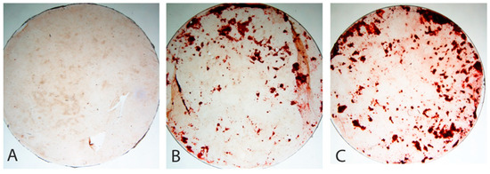 Figure 9 presents an indirect alizarin red analysis for Ti-15Nb alloy after RC heat treatment in a primary culture of osteogenic cells for seven days. The presence of mineralized nodule formation, evaluated by alizarin red staining, supported the cell viability assay. In the cells without supplementation with AA + βGP (base medium), no mineralized bone-like nodule formation was identified after seven days, as can be seen in Figure 9A. On the other hand, a significant increase in nodular staining was observed in the cell culture with the Ti-15Nb alloy extract after the RC heat treatment supplemented with AA + βGP (Figure 9B), as well as in the positive control group (AA + βGP), as shown in Figure 9C. Similar data have been presented in recent studies with CP-Ti, where contact with this material did not interfere in the formation of a mineralized bone matrix, even without surface treatment [28,46,47,48].