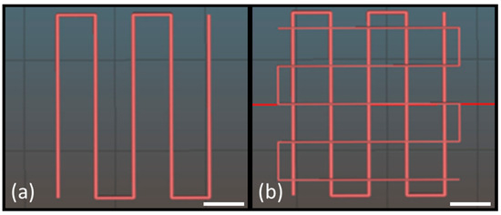 Two different patterns were designed and printed (Figure 1) to calculate the spreading ratio (SR) and the shape fidelity (Pr) according to the following Formulas (1) and (2), respectively: