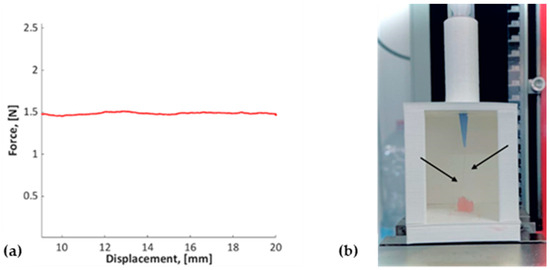 (a) Extrusion force measured for the fibrinogen-based biomaterial ink using the dedicated setup implemented to assess the solution homogeneity; (b) filament-like shape of extruded biomaterial ink (indicated by black arrows) during the extrusion process.