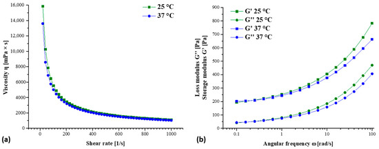 Rheological characterization of biomaterial ink at 25 and 37 °C: (a) flow curve as a function of shear rate; (b) curves of storage (G′) and loss (G″) modulus vs. angular frequency.