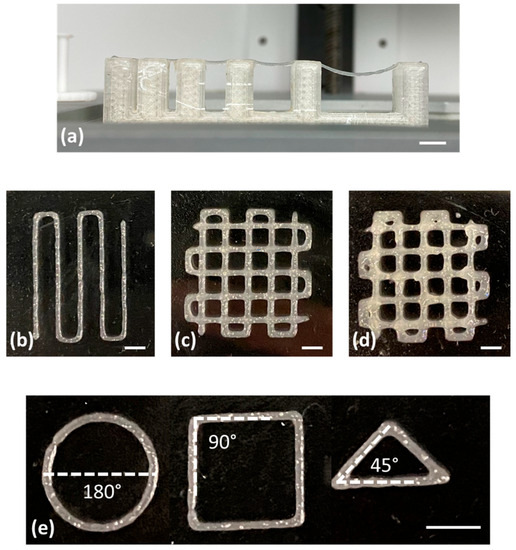 Biomaterial ink printability assessment in terms of (a) filament collapse test, (b) spreading ratio, shape fidelity, (c) 4 layers, (d) 8 layers, and (e) printable angles; scale bar, 5 mm.