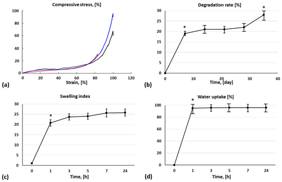 (a) Mechanical compression tests on three crosslinked 3D-bioprinted constructs using the fibrinogen-based biomaterial ink, (b) degradation rate, (c) water uptake, and (d) swelling ratio of biomaterial ink; * p < 0.05 between two consecutive time points.