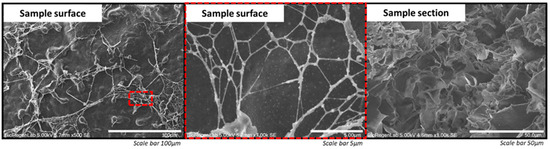 The SEM was employed for the morphology analysis of developed fibrinogen-based biomaterial ink after the chemical dehydration of crosslinked samples. In Figure 6, captured images of the surface and section of a 3D-bioprinted construct are reported. As expected, the fibrinogen-based biomaterial ink presents a nanofibrous structure with a thickness of fibrin fibers of 207 ± 48 nm. Fibers create a highly porous microstructure with interconnected pores of variable diameters (range of 20–100 µm), as observed in a sample section.