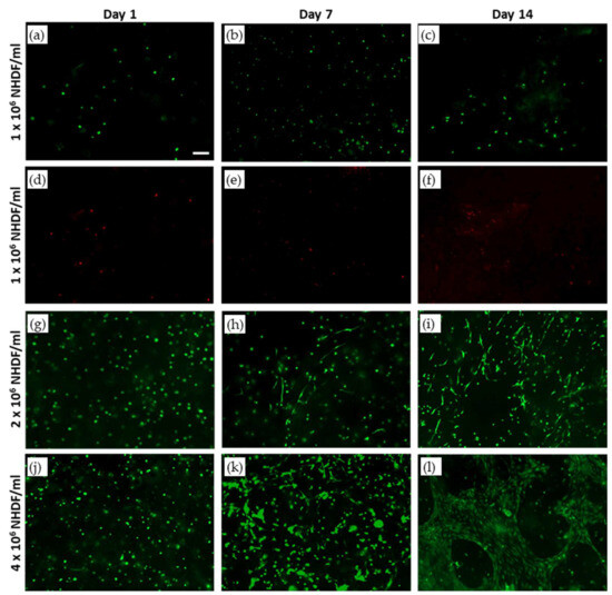 Live/dead staining of 3D-bioprinted samples with cell densities of (a–f) 1 × 106 NHDF/mL, (g–i) 2 × 106 NHDF/mL, and (j–l) 4 × 106 NHDF/mL at days 1, 7, and 14 of in vitro culture; scale bar, 100 µm.