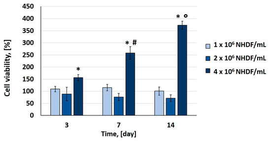 XTT assay on samples biofabricated using 1, 2, and 4 × 106 NHDF/mL at days 0, 3, 7, and 14 of in vitro culture. The absorbance values measured immediately after printing were assumed as 100% of cell viability. Data are presented as mean ± SD (n = 3). * p < 0.05 statistically significant differences among the samples biofabricated with 4 × 106 NHDF/mL at days 3, 7, and 14 with respect to day 0; # p < 0.05 statistically significant differences among the samples biofabricated with 4 × 106 NHDF/mL at days 3 and 7; ° p < 0.05 statistically significant differences among the samples biofabricated with 4 × 106 NHDF/mL at days 7 and 14.