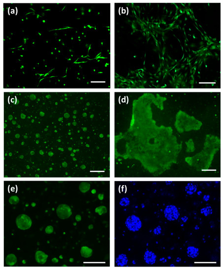 Staining of 3D-bioprinted construct with calcein AM of (a,b) NHDF cells at days 7 and 14 of in vitro culture and of (c,d) HaCaT cell at days 7 and 14 of in vitro culture; (e,f) calcein AM and Hoechst 33342 staining of HaCaT keratinocytes; scale bar, 100 µm.
