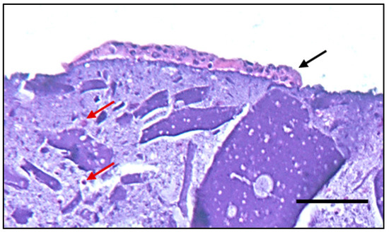 Representative image of H&E staining at day 14 of culture of equivalent fabricated by HaCaT seeding 24 h after dermal layer bioprinting. HaCaT and NHDF cells are indicated by black and red arrows, respectively; scale bar, 200 µm.