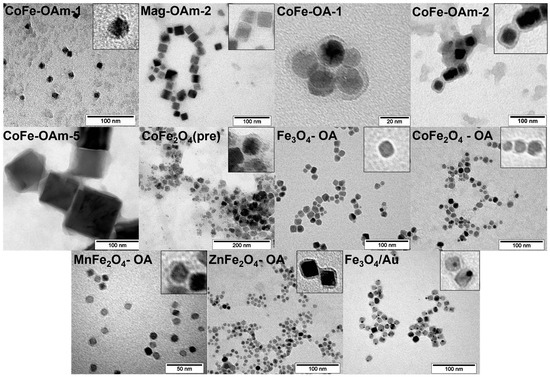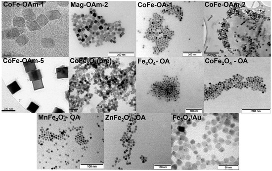 As was previously shown, there is no ideal size and shape of MNPs that will be suitable for every possible application. For example, in the case of application MNPs as T1 contrast agents for an MRI, ultrasmall MNPs with core sizes of less than 5 nm should be used, whereas, for T2 contrast properties, anisotropic MNPs with sizes up to 20 nm are preferential [41,42,43]. On the other hand, for magnetic hyperthermia, anisotropic MNPs (rod- or cube-like morphology) are preferential [44]. In order to demonstrate the versatility of the proposed coating, we decided to synthesize a series of bare MNPs. Magnetite and different ferrite (Co, Mn, and Zn) nanoparticles were obtained by the thermal decomposition method in the presence of oleic acid or its combination with oleylamine. For the dumbbell-shaped Fe3O4/Au nanoparticles, we used the same chemical approach, and there was the CoFe2O4 sample, obtained by the coprecipitation technique. The morphology of the nanoparticles was analyzed by TEM, including MNP core-size determination, and the results are presented in Figure 1 and Table 2. Among the received data, one could mention quite a significant range of diameters (from 8 to 100 nm) and various nanoparticle shapes. At the same time, all of them were magnetic, and the corresponding values of saturation magnetization, remanent magnetization, and coercivity were determined (Table S1).