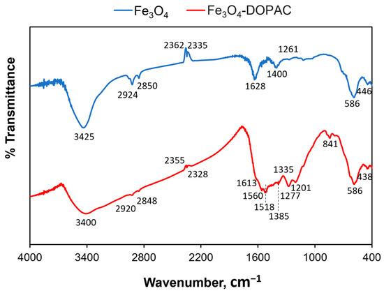 The representative FTIR spectra of the DOPAC-modified and bare Fe3O4 nanoparticles.