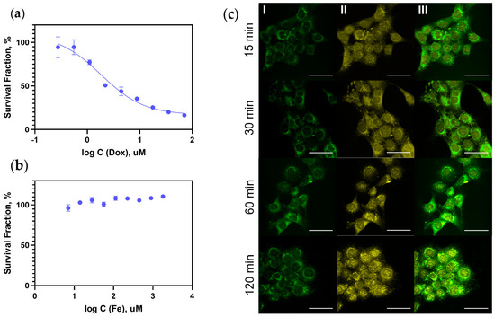 In vitro studies of DOPAC-modified Fe3O4-Au-DOPAC-HSA MNPs on 4T1 cells: (a,b)—MTS test results for Dox-loaded and empty MNPs, correspondingly; (c) I—Fe3O4-Au-DOPIHSA-PEG@Dox internalization process in 4T1 cells. I—FAM (fluorescein amidite) fluorescence, corresponding to MNPs, II—Dox fluorescence, III—merge, laser scanning confocal microscopy, scale bar 50 um.