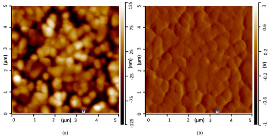 The surface relief is an important element to validate the dip-coating experimental conditions. A first glance at the impact of sol–gel deposition on the coating morphology is provided on Figure 1. It shows images produced by AFM measurements of the coating, which was made by mixing HAp with PEI after being overlayed onto the silica wafer and annealed. The AFM probe provides a precise nanoscale measurement of the different cliffs and clusters. Figure 1a provides the topography (the relief depth is ±125 nm on the AFM picture) and Figure 1b provides the deflection signal. A bright point in each image indicates a high value while a dark point indicates a low value. One can observe from the topography images that slight agglomerations of brighter light are dispersed throughout the sample. They are attributed to the coating domain with a higher thickness, while the black parties should indicate the absence of coating in the probed area. One can consider, despite slight irregularities, that the coating is fairly homogeneous. Moreover, one can observe that the surface does not exhibit any cracks.
