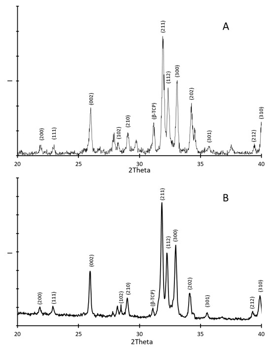 XRD analyses on (A) synthesized hydroxyapatite; (B) the coating made from the mix of HAp and PEI and deposited on the silica wafer.