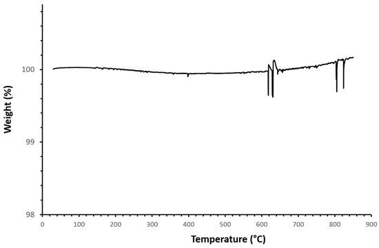 While previous results attest to the coating survival consecutive to the annealing procedure, the removal of PEI, which is expected to degrade at about 300 °C, remains to be verified. According to the TGA results, presented in Figure 3, the process of heating silicon wafers coated with the HAp and PEI mix under a nitrogen atmosphere does not reveal significant loss of mass from the ambient temperature up to 900 °C. Only above 600 °C could some artefacts of measurements be observed, which are probably linked to the impact of high temperature on the sensors. The absence of any degradation signature might indicate that PEI was properly decomposed during the previous annealing step. Nevertheless, it is worth mentioning that data collected from the literature do not necessarily agree concerning the behaviour of HAp when submitted to a temperature ramp.