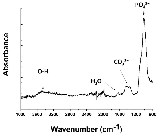 Therefore, the results obtained from thermogravimetric and calorimetric investigations were complemented with infrared spectroscopy analyses. The resulting spectrum is presented in Figure 5. The PEI infrared signature [75] is classically characterized by the N–H stretching band at 3300 cm−1, the C–H stretching bands around 3000 cm−1, the C–H stretching bands around 3000 cm−1, the bending vibration of the CH2 group at 1500 cm−1, and the C–N stretching band around 1100 cm−1. No peak was recorded at these characteristic wavenumbers. On the other hand, the obtained spectrum is in good agreement with references from the literature describing the infrared signature of hydroxyapatite [76,77], which confirms the adhesion of the coating, as shown in Figure 2. At about 1050 cm−1, a main intense peak is recorded, which can be attributed to the asymmetric stretching vibration of phosphate P–O bonds. Around 1400 cm−1, one can find the broad signature of C–O bond asymmetric stretching from carbonate ions. The small peak above 1600 cm−1 belongs to residual water according to Prekajski et al. [78]. Finally, the broad peak located between 3200 and 3600 cm−1 is linked to O–H bonds, but its intensity remains weak, probably due to the strong annealing procedure performed prior to the material characterization. The unambiguous infrared signature of hydroxyapatite indicates that the infrared spectroscopy is adequate to investigate the composition of the coating. Due the absence of band characteristics of PEI, one can think that the annealing treatment successfully removed any trace of PEI.