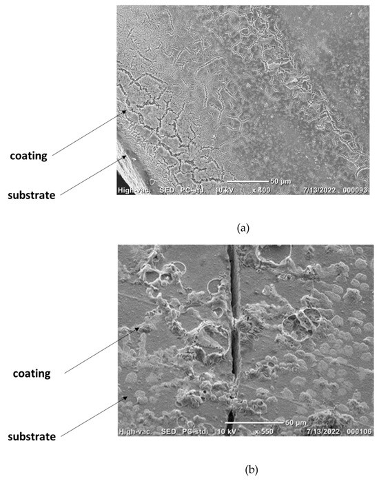 The HAp coating was seemingly preserved after the removal of PEI. A conceptual test was performed by comparing coatings of HAp alone and HAp mixed with PEI on 3D-printed zirconia. Zirconia is a commonly used material in dentistry implants, and its compatibility with this HAp coating is a main requirement for future applications. SEM pictures of both systems are presented in Figure 6. These describe the coating morphology and adhesion for each case. The picture presented in Figure 6a was obtained after analysing 3D-printed zirconia coated with the HAp and PEI mixture. It shows the cross-section between a coated and an uncoated part after the sample was cut in two. The coating is clearly visible, and it apparently takes the form of the porous structure obtained by the rapid prototyping procedure. It is not perfectly uniform, in comparison with reports from literature regarding dense systems, for example the report by Jiang et al. [79]. However, a clear improvement is noticeable when compared with the HAp coating alone (Figure 6b), which exhibits a much-disorganised repartition of the coating with insulated portions of HAp facing many wide empty spaces. Moreover, the bare-coated sample also exhibits a craze that may indicate a more fragile structure in the absence of ligand polymer. Therefore, a clear improvement of the coating adhesion is assessed when HAp is coupled with PEI before being deposited. In other terms, HAp coating alone is not sustainable on 3D-printed zirconia; thus, HAp-PEI is proposed as a coating instead. It is worth mentioning that the HAp-PEI does not fully cover the surface of the substrate either. This could be related to the quantity of material being too low. It is expected that a higher grafted quantity of material would lead to a more continuous coating.