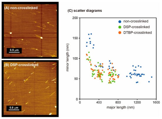 32], in the case of non-crosslinked nanofiber-polyplexes, DNA condensation was suppressed because of the PEG crowding effect, and an elongated morphology with a long axis length of ~1000–1300 nm was observed in the AFM observations. This range of the long axis length is comparable to the length of the twisted pDNA structure used here (approximately 1200 nm; 7 kbp × 0.34 nm/bp/2 = 1190 nm). There was no difference in the distribution of the crosslinked polyplexes when using either the DSP or DTBP cross-linking reagent, and no morphology with a long axis length of more than 1000 nm was observed (