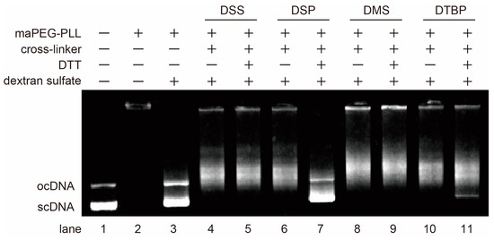 Figure 1), confirming the stabilization by means of the cross-linkages (lanes 4, 6, 8 and 10). In the polyplexes stabilized with cross-linking reagents with no SS bond, there was no change in the migration band caused by adding the reducing agent DTT (lanes 4 and 5 for DSS, lanes 8 and 9 for DMS). That is, the cross-linking of the polyplex using DSS or DMS with no SS bond in the molecule led to irreversible stabilization. In contrast, for polyplexes stabilized via cross-linking reagents with SS bonds (DSP, DTBP), pDNA was released upon adding DTT (lanes 7 and 11). This release of pDNA occurred because the entanglement between the crosslinked PLL chains and DNA is resolved via cleaving the SS bonds. Additionally, more pDNA was released upon DTT addition in the DSP-crosslinked polyplex than in the DTBP-crosslinked polyplex. Differences in the reaction between the cross-linking reagents and Lys residues may be responsible for this observation. As shown in