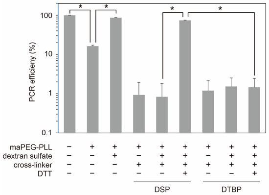 Figure 4). As previously reported, the non-crosslinked polyplex showed relatively high PCR efficiency (ca. 15%) as a polyplex. Adding dextran sulfate increased the PCR efficiency to 87% because of the release of pDNA from the polyplex. The PCR efficiency of both the DSP-crosslinked and DTBP-crosslinked polyplexes decreased to just under 1% because of the introduction of cross-linkages. The addition of dextran sulfate did not lead to an increase in the PCR efficiency because no pDNA was released, as shown in