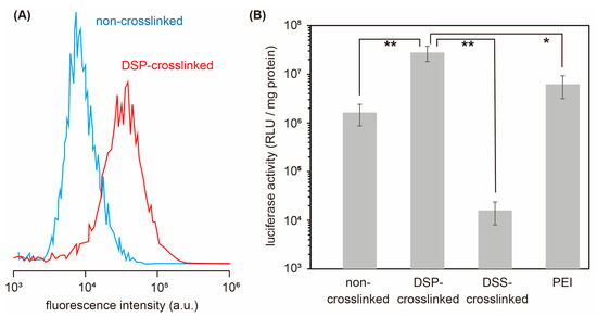 33]. The DSP-crosslinked polyplexes showed an effective buffering effect for endosomal escape. The DSP-crosslinked polyplexes were likely destabilized through SS bond cleavage in an intracellular reducing environment and transformed into polyplexes that exhibit high transcription efficiency. The transfection efficiency level of the DSP-crosslinked polyplexes also exceeded that of the PEI polyplexes, which are the representative polyplex.