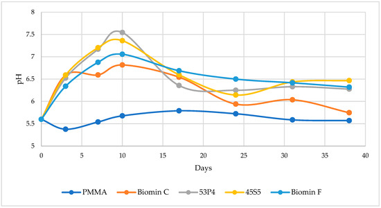 The ability of bioactive materials to regulate pH levels in the mouth’s environment is a critical aspect of their functionality [5,6]. One way to prevent enamel demineralisation and inhibit the growth of microorganisms is by raising the pH of the environment to above 5–5.5 [20]. To assess whether the combination of acrylic specimens and bioactive glass can influence pH, PMMA (the reference material) and acrylics modified with 20% BAGs were placed in containers, each containing 10 mL of distilled water. For the test, five discs, each measuring 6 mm in diameter and 2 mm in thickness, were used for each material, resulting in a total of 25 specimens. These containers with acrylic discs were then placed in a laboratory drying oven set at 37 °C. At specific time intervals (initially after 3 days and then every 7 days thereafter), the specimens were removed from the drying oven. After cooling to room temperature, their pH levels were measured using a Mettler Toledo pH 7110 SET instrument (Mettler Toledo sro, Prague, Czech Republic) equipped with a SenTix® 81 electrode and 3 mol/L KCl buffer solutions. The instrument required daily calibration, which was performed using pH = 7 buffers from the same company. Following each pH measurement, the entire solution was removed from the container, and the container was rinsed with distilled water (DW). The specimen was then dried using filter paper, and a new portion of DW (pH = 5.6) was added.