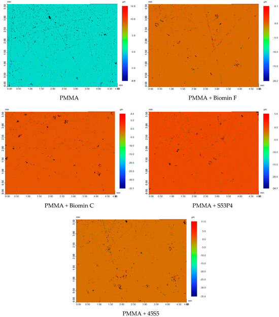 Surface roughness is observed in all specimens, whether in dry or wet conditions. The specimens with the lowest roughness are found in the PMMA resin and when Biomin F and Biomin C are added to PMMA; however, this difference is not statistically significant. Glass 45S5 and S53P4 contribute to greater surface roughness than the pure polymethyl methacrylate specimen. After 7 days of storage in water, there is a slight increase in surface roughness, although this difference is not statistically significant when compared to the specimen with pure PMMA. For specimens that include bioactive glasses, darker discolouration can be observed in Figure 3, indicating clusters of undispersed fillers.