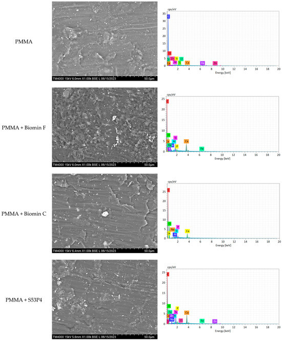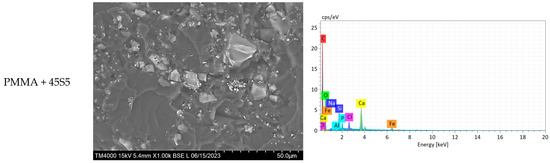 The surface SEM images and elemental composition of the prepared specimens are presented in Figure 4 and Table 3. Surface images of PMMA with the addition of bioactive glasses reveal the presence of lighter crystals of bioactive glasses with a size of 1 μm distributed within the material’s structure. However, in some regions, clusters of unmixed BAGs of approximately 20 μm are visible (e.g., 45S5 and Biomin C).