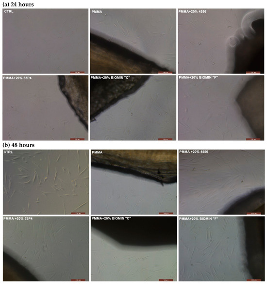 Figure 5 depicts the appearance of human gingival fibroblast cells in direct contact with acrylic material specimens containing 20 wt.% bioactive glass. After 24 and 48 h of contact, the size, shape, and number of cells remain unchanged. Figure 6 presents the percentage of cell viability using the Presto Blue test, which stains live cells. In the case of Biomin F and S53P4, cell viability exceeds 80%, and after 48 h, it exceeds 120% of the number of reference cells. Other glasses and PMMA also do not show significant changes in cell viability. Similar results were also obtained in the second MTT test.