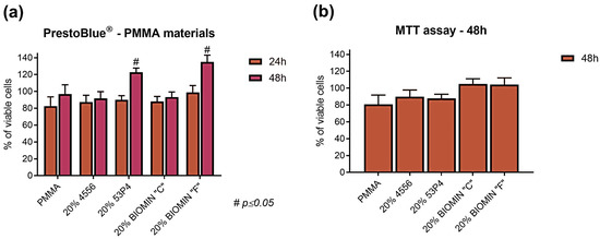 Viability of human cannon fibroblast cells in direct contact with acrylic specimens containing bioactive glasses measured by (a) PrestoBlue® assay after 24 and 48 h, and (b) MTT assay after 48 h. Statistically significant for # p < 0.05 in comparison to untreated CTRL, and 24 vs. 48 h.