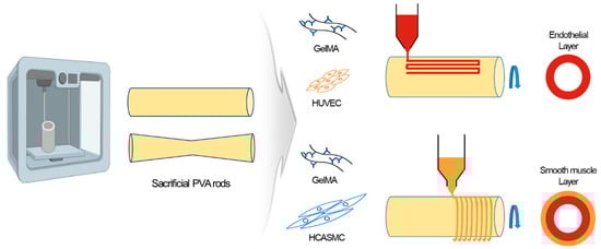 The rods were printed using a fused deposition modeling (FDM)-based 3D printer. The rod was made of PVA filament so that it could be easily separated after printing. The printed rod was in the form of a cylinder, with a diameter of 5 mm and a length of 2 cm. The vascular model was fabricated using an extrusion-based bioprinter, and the 3% GelMA bioink was used for the endothelial layer and 5% GelMA bioink was used for the smooth muscle layer. The endothelial layer was printed to be aligned in the blood flow direction, and the smooth muscle layer was printed in the circumferential direction. A UV lamp was used to crosslink the printed structure once the smooth muscle layer printing was completed. The UV lamp was irradiated for 20 s at a 10 mm distance from the structure.