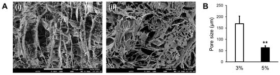Pore size of the two different concentrations of gelatin–methacryloyl (GelMA) bioinks. (A) Scanning electron micrographs of (i) 3 and (ii) 5% GelMA bioinks and (B) pore size assessment of the two concentrations of GelMA bioinks (** p < 0.01).