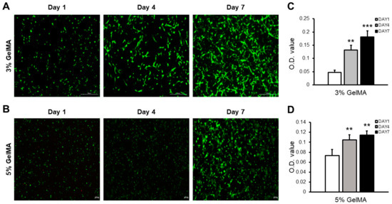 As mentioned previously, the pore size of the bioink decreased with an increase in the concentration of the GelMA bioink, which can affect the cell viability and proliferation [18]. To evaluate the cytotoxicity and effect of the pore size, cells with two different GelMA bioinks were printed by encapsulating the cells in GelMA bioinks, followed by a bioprinting process. Printed samples were cured by UV irradiation for 20 s [19]. As shown in Figure 3A,B, the cells were alive in both the 3 and 5% GelMA bioinks, and the number of viable cells increased with an increase in the cell culture period.