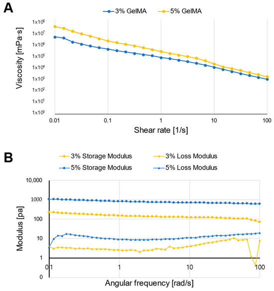 Parameterization of the two GelMA bioinks. (A) Viscosity of the 3 and 5% GelMA bioinks, (B) rheological assessment of the 3 and 5% GelMA bioinks.
