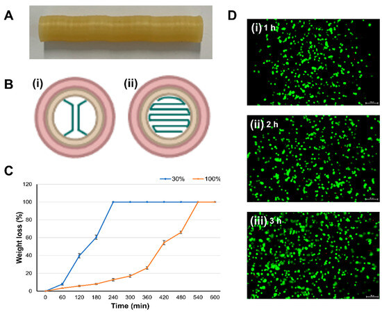 (A) Gross image of the sacrificial PVA rod, (B) infill patterns of the 30 and 100% of PVA sacrificial rod (i. 30%, ii. 100%), (C) result of the PVA sacrificial rod degradation test, (D) cytotoxicity test results according to PVA degradation.