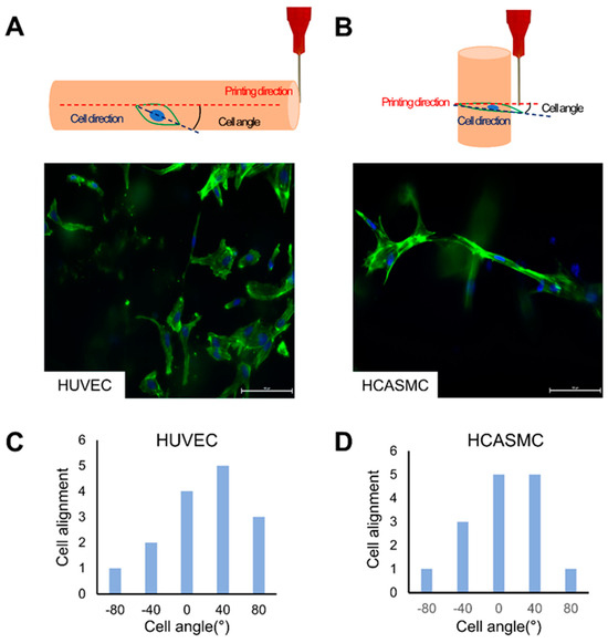 Cell alignment according to the printing direction. Image of cell alignment according to the dapi/phalloidin staining of (A) HUVECs and (B) HCASMCs (scale bar: 100 µm), (C,D) graphs showing the alignment of cells quantitatively by measuring the cell angle of F-actin.