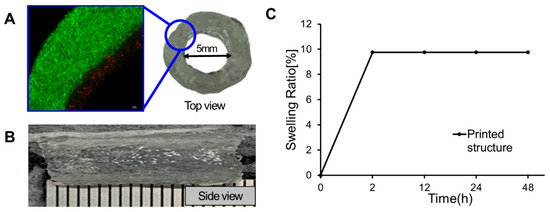 Figure 7A,B shows the printed blood vessel model. Before printing the model, HUVEC was stained red and HCASMC was stained green. In actual blood vessels, the endothelial cell layer consists of a single layer of endothelial cells and is thinner than the smooth muscle layer. By adjusting the printing pressure and the moving speed of the nozzle, the endothelial layer was printed thinner like the structure of an actual blood vessel, and it can be confirmed that the printing was similar to the actual blood vessel through the stained image. As two different GelMA bioinks with different pore sizes and concentrations were utilized, the vascular structure could be printed by separating it into two (endothelium and smooth muscle) layers. While studies are ongoing to develop multi-scale native-mimicking vascular 3D models using various hybrid techniques, cell alignment has proven challenging. However, our method enables the alignment of two types of cells in opposite directions, closely mimicking the cellular arrangement observed in actual blood vessels [31,32,33]. Furthermore, compared to other vascular structure fabrication methods, this method could be used to fabricate large diameter-sized vascular structure (diameter over than 5 mm) in a stable manner. The swelling characteristic of the printed structure is critical for tissue engineering applications as they directly influence solute mobility and diffusion, as well as the mechanical properties of the scaffold [34]. The swelling properties of the printed structure were observed to be constant from 2 h after printing, indicating that the printed structure maintained its shape 2 h after printing.