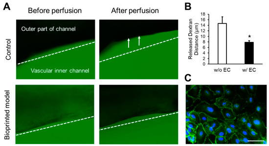 The barrier function of endothelial tissue was evaluated using 70 kDa FITC-conjugated dextran (Sigma Aldrich). Briefly, dextran (25 μg/mL) was added to the endothelium medium (EGM-2 BulletKit, Lonza, Benicia, CA, USA), and the printed vascular model was perfused at a rate of 20 μL/min using a syringe pump. The fluorescence intensities of the samples were detected using a fluorescence microscope.