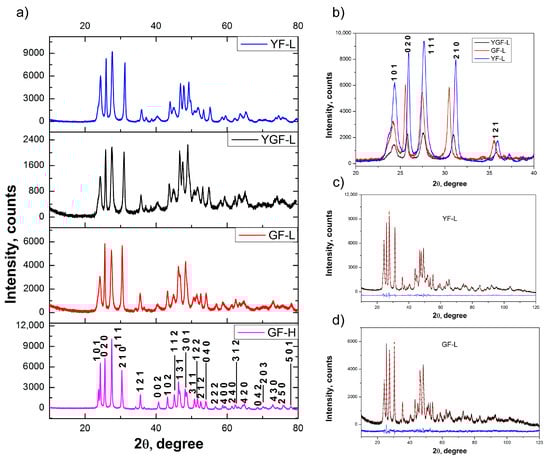 XRPD patterns of Y0.8−xGdxF3:Yb0.18Er0.02 samples (a) reflection shifting due to Gd3+ content increase (b) and Rietveld refinement of samples YF-L and GF-L (c,d). In (b–d) the experimental data are shown as the black solid line while the red dotted pattern corresponds to the calculated data. The differences between the observed and calculated intensities are plotted in the blue line.
