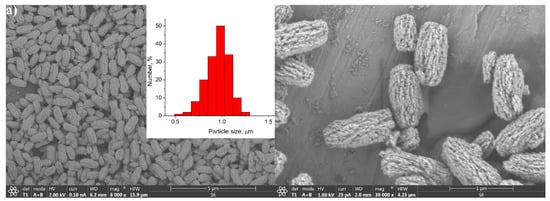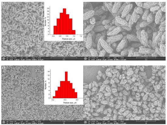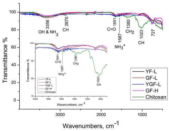 The Fourier transform infrared (FTIR) spectra of the synthetized samples and pure chitosan presented in Figure 7, indicate the preservation of chitosan ligands onto the surface of mesocrystals. According to the literature data [26,27,28], the spectrum of pure chitosan can be classified as follows: broad band at 3500–3000 cm−1 (stretching vibration of hydroxyl O-H which overlaps with amine N-H group); band at 2870 cm−1 (C-H bond in –CH3); bands at 1651.7 cm−1 and 1587 cm−1 (C=O stretching (amide I) and NH stretching (amide II), respectively); bands at 1417.9 cm−1 and 1374.1 cm−1(CH3 bending vibrations); band at 1149.9 cm−1 (asymmetric vibration of the CO group); a band near 1060.2 cm−1 (CO bending vibrations of the pyranose ring). The FTIR spectrum of the samples showed a decrease in adsorption and a slight shifting of chitosan related bands at: 3399.9 cm−1 (-OH and amine -NH group stretching), 1651.7 cm−1 (C=O stretching), 1557 cm−1 (protonated amine stretching), 1373.5 cm−1 (CH2 bending) and 1080.4 cm−1 (CO bending), implying its preservation at the particles surface.