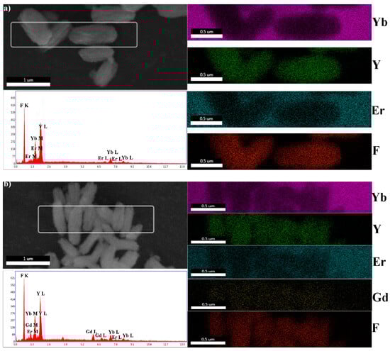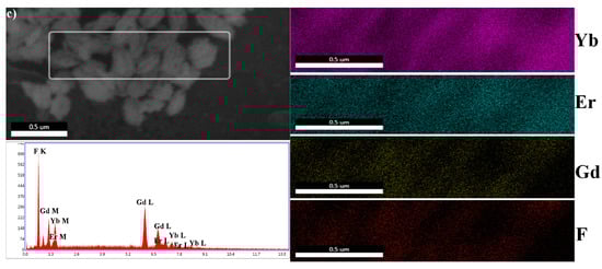 The size and the morphology of the synthetized particles were revealed by (SEM and TEM. The particles obtained from the precursors with a low concentration have an elongated shape similar to unshelled peanuts, the length of which decreases from 1 µm to 300 nm as the gadolinium content increases, Figure 2. The particles appear to be non-agglomerated and quite uniform in size. As observed in Figure 2, they are composed of smaller nanocrystals and are porous to a certain degree. Their high purity and the uniform distribution of all constituting elements (yttrium: Kα at 14.931 and Lα at 1.92 keV; ytterbium: Lα at 7.414 and Mα at 1.404 keV; erbium: Lα at 6.949 and Mα at 1.521 keV; gadolinium; Kα at 6.053 and Mα at 1.181 keV; and fluorine: Kα at 0.677), are confirmed by EDS elemental mapping, Figure 3.