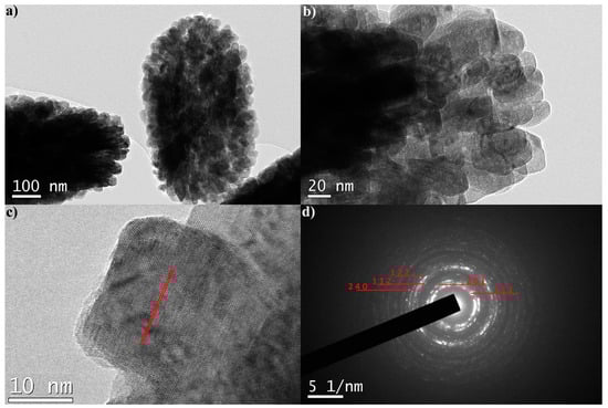 TEM images (a–c) and SAED pattern of GF-L mesocrystals (d). Red lines in (c) indicate crystal planes.