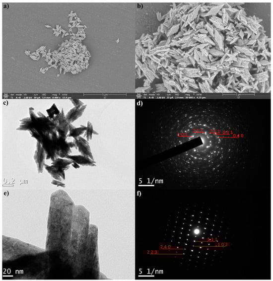 With the increased precursor concentration, a change in the particles’ morphology was detected. The formation of rhombic mesocrystals with a layered structure, and the diagonal length up to 0.4 µm, were revealed by the SEM analysis, Figure 6a,b. They are built by orientational ordering and layering of thin plates, Figure 6c. As it is notable from the TEM image shown in Figure 6e, the formation of plates is effectively guided by the oriented attachment of rod-like Gd0.8F3:Yb0.18Er0.02 monocrystals whose indexed diffraction spots are given in Figure 6f.